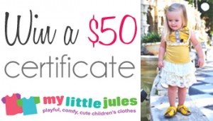 My Little Jules is offering a $50 certificate to one lucky reader of mine.