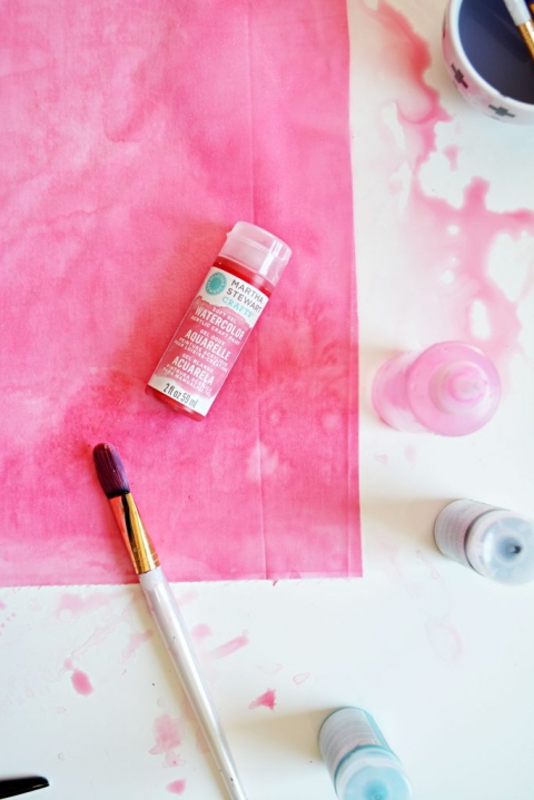 – Apply a drop of paint of your choice, squirt some water over the paint and then use a brush to dab around the fabric. Use more water to spread the watercolor. Have fun with it and use water to dilute and make the color lighter. Water is the key!