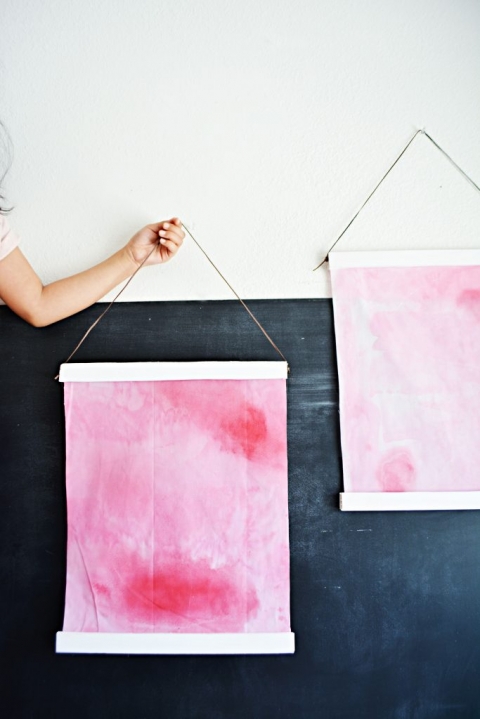 – Using hot glue. Glue the fabric in between the wood. Hot glue a string to hang.